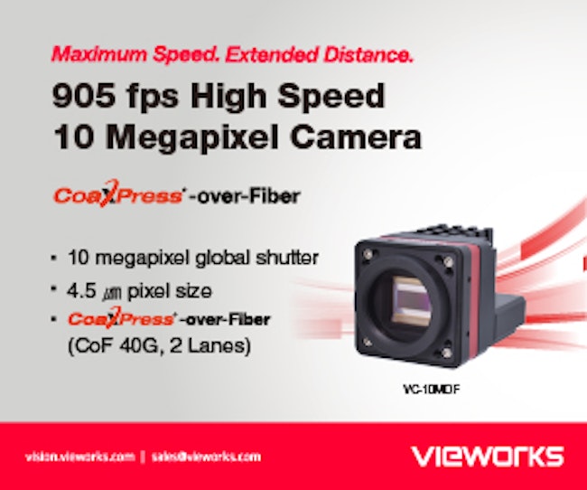 Delivering frame rates up to 905 fps, VC-10MDF with CoaXPress-over-Fiber interface (40G, 2 Lanes) meets customer demands for ultra high speed and longer cables. The VC-10MDF features a 10 megapixel global shutter sensor with 4.5 ㎛ pixel size. Applications include display inspection, semiconductor inspection, and 3D profiling. Available in fan type and heatsink type.